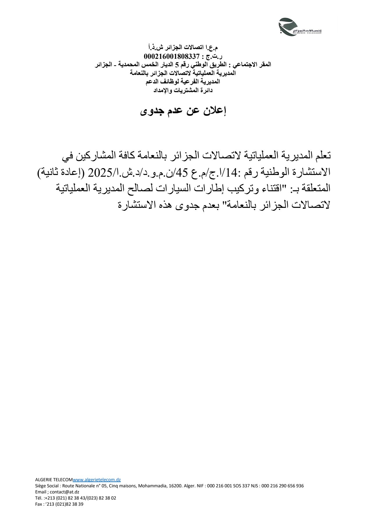 اقتناء وتركيب إطارات السيارات لصالح المديرية العملياتية لاتصالات الجزائر بالنعامة
