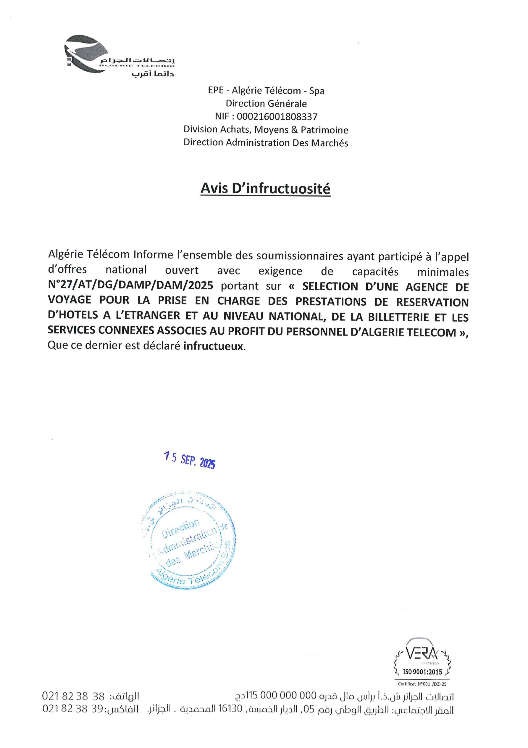 SELECTION D’UNE AGENCE DE VOYAGE POUR LA PRISE EN CHARGE DES PRESTATIONS DE RESERVATION D’HOTELS A L’ETRANGER ET AU NIVEAU NATIONAL, DE LA BILLETTERIE ET LES SERVICES CONNEXES ASSOCIES AU PROFIT DU PERSONNEL D’ALGERIE TELECOM