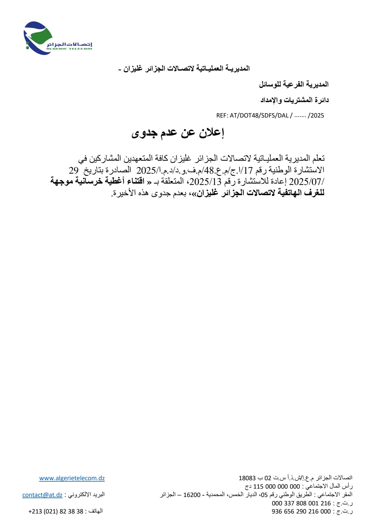 إعـلان عــــن استشارة وطنيــــة رقــــــــم: 17/2025 إعادة لرقم 13/2025