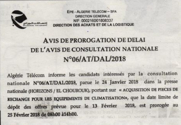 AVIS DE PROROGATION DE DELAI DE L’AVIS DE CONSULTATION NATIONALE N°06/AT/DAL/2018