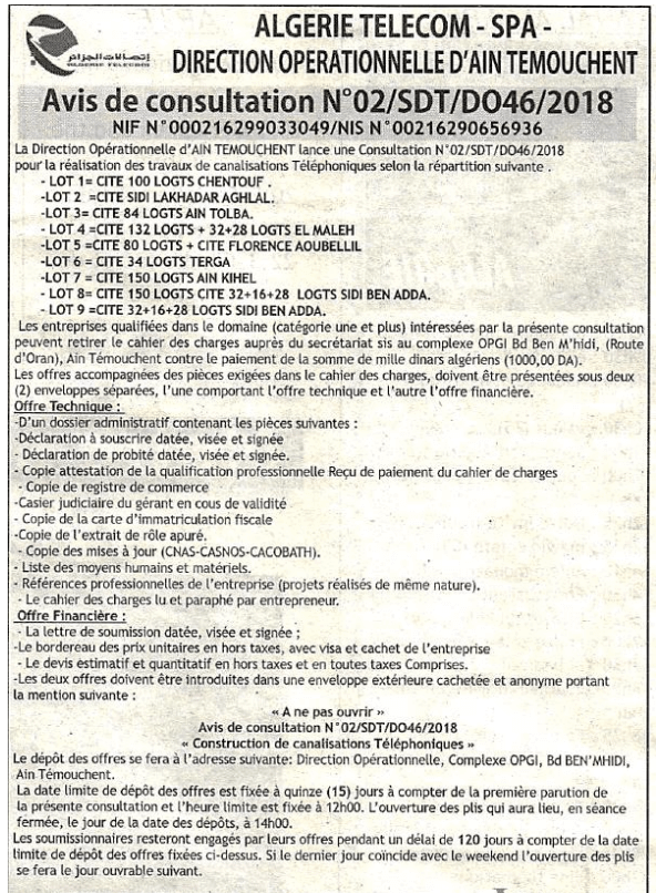 Avis de consultation nationale N°02/SDT/DO46/2018