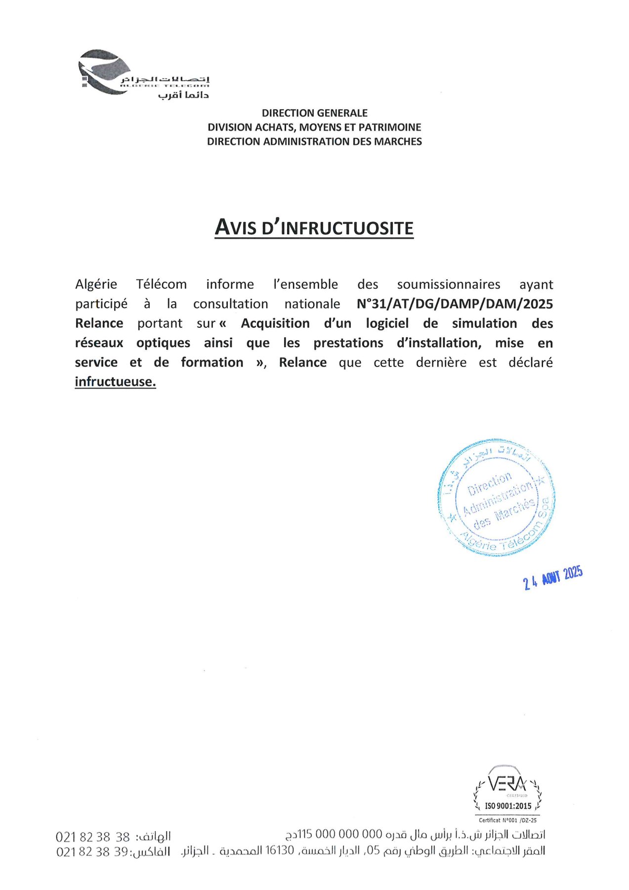 N°31/AT/DG/DAMP/DAM/2025/Relance